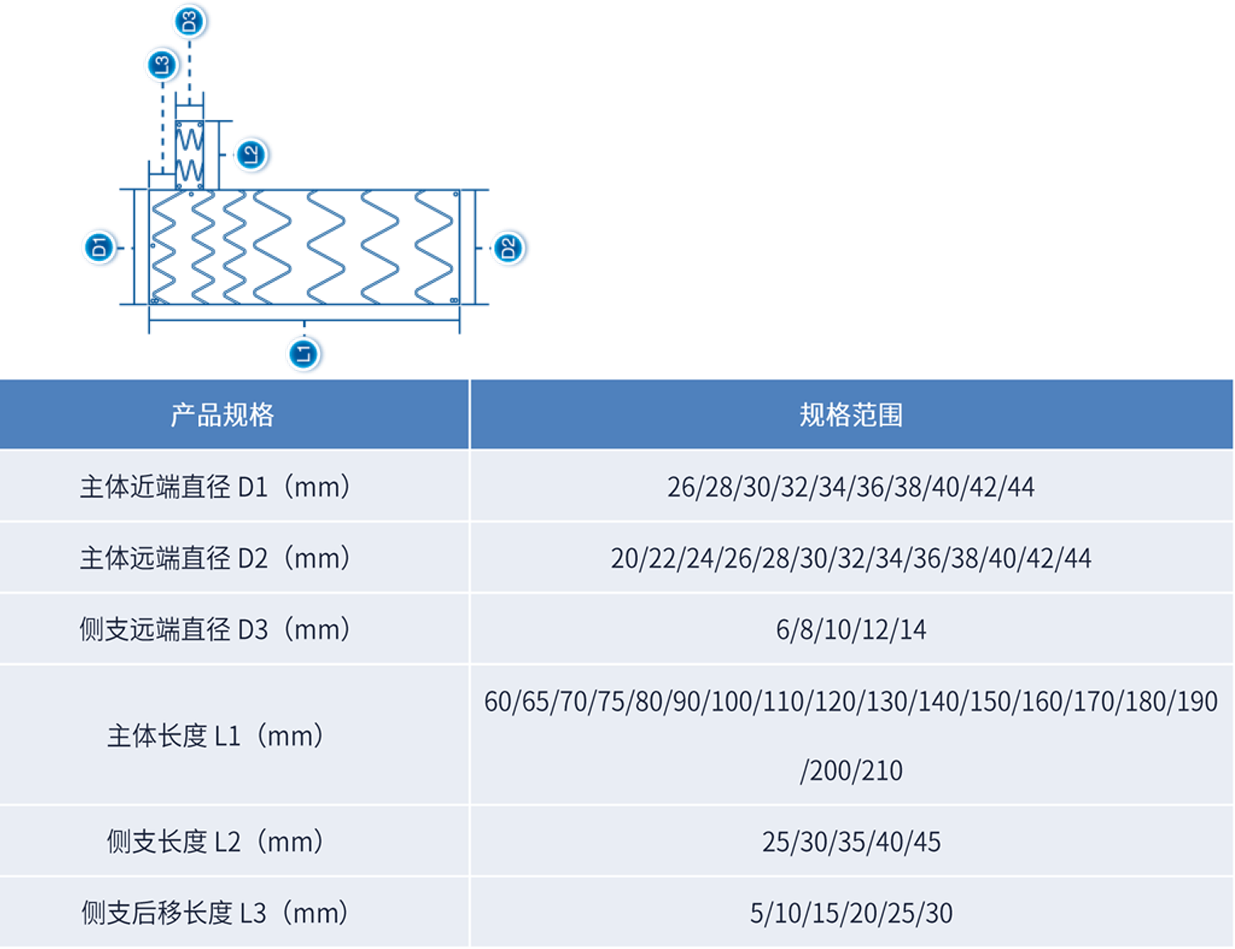 Castor®/通天戈™分支型主动脉覆膜支架及输送系统该产品用于治疗胸主动脉夹层,且其近端破口在左颈总动脉远端15mm与左锁骨下动脉(LSA)远端20mm之间或夹层逆撕至LSA。覆膜支架锚定区长度应≥15mm。